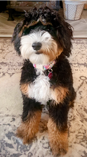 |  | Shelby Avenue RubySue Ruby is an awesome girl that loves everyone and everything. She is smart, social and happy, and she loves her snuggle time. Ruby is more of a medium size, weighing in at 40-45 pounds, though she does have some small dogs in her pedigree, so can have minis and mediums (her dad is 20 pounds). Ruby has been bred to Benny for her first litter of Australian Bernedoodle Puppies, due around Thanksgiving 2025. Ruby is a chocolate parti tricolor. |
